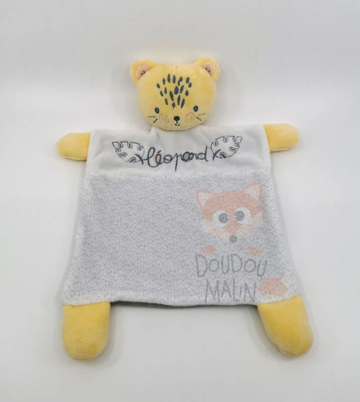 Doudou léopard Mots d’enfants bleu blanc 30 cm personnalisable.